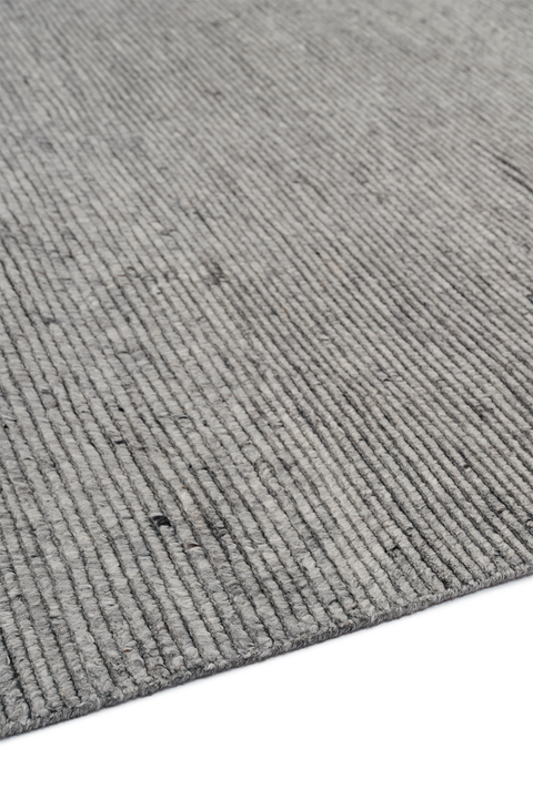 Handwoven in undyed New Zealand, The Ridge Stone Rug showcases organic variations in colour. Layering a flatwoven dark graphite base with soft rows of smoky grey cut pile, it captures the rising contours of natural landscapes with stripe-like linear ridges; alternating textures and the luxuriously shaggy pile height create sculptural softness and tactile depth.